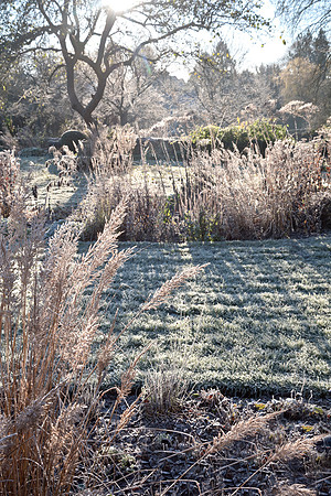 Perennial garden, winter frost.