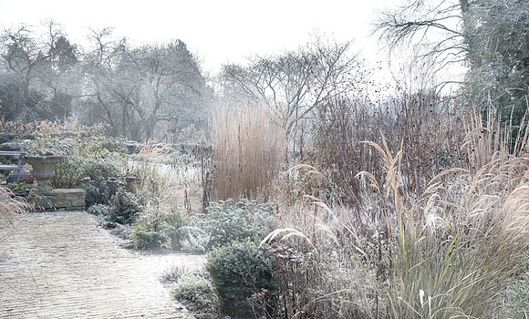 Perennial garden, winter frost.