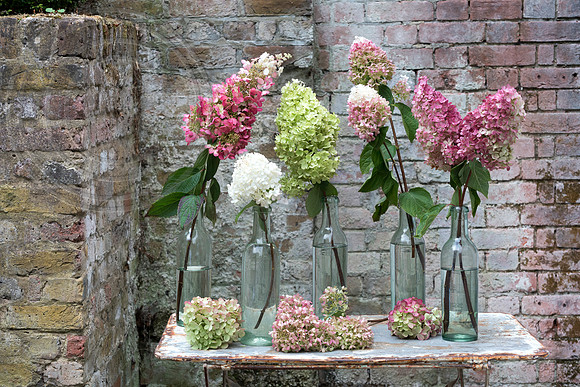 Hydrangea paniculata specimens on garden table