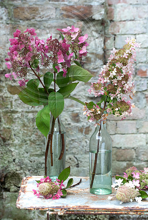 Hydrangea panicualta display in bottles on garden table