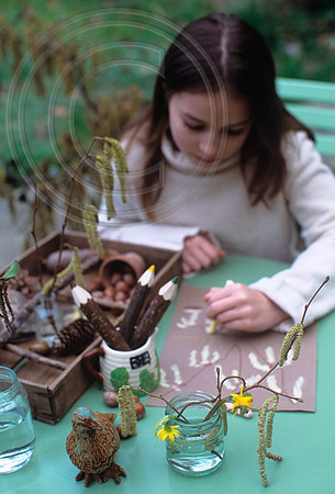 Girl drawing catkins and narcissus - Nature Table Story