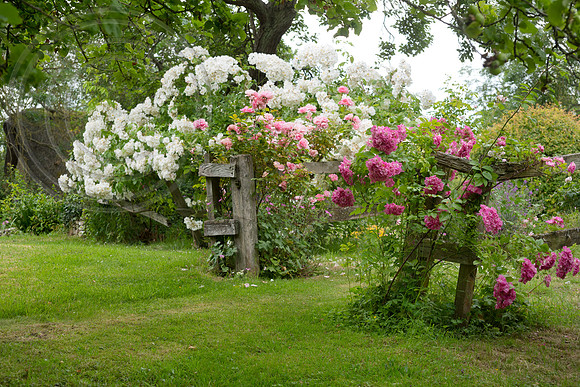 white and pink rambling roses on wooden fence